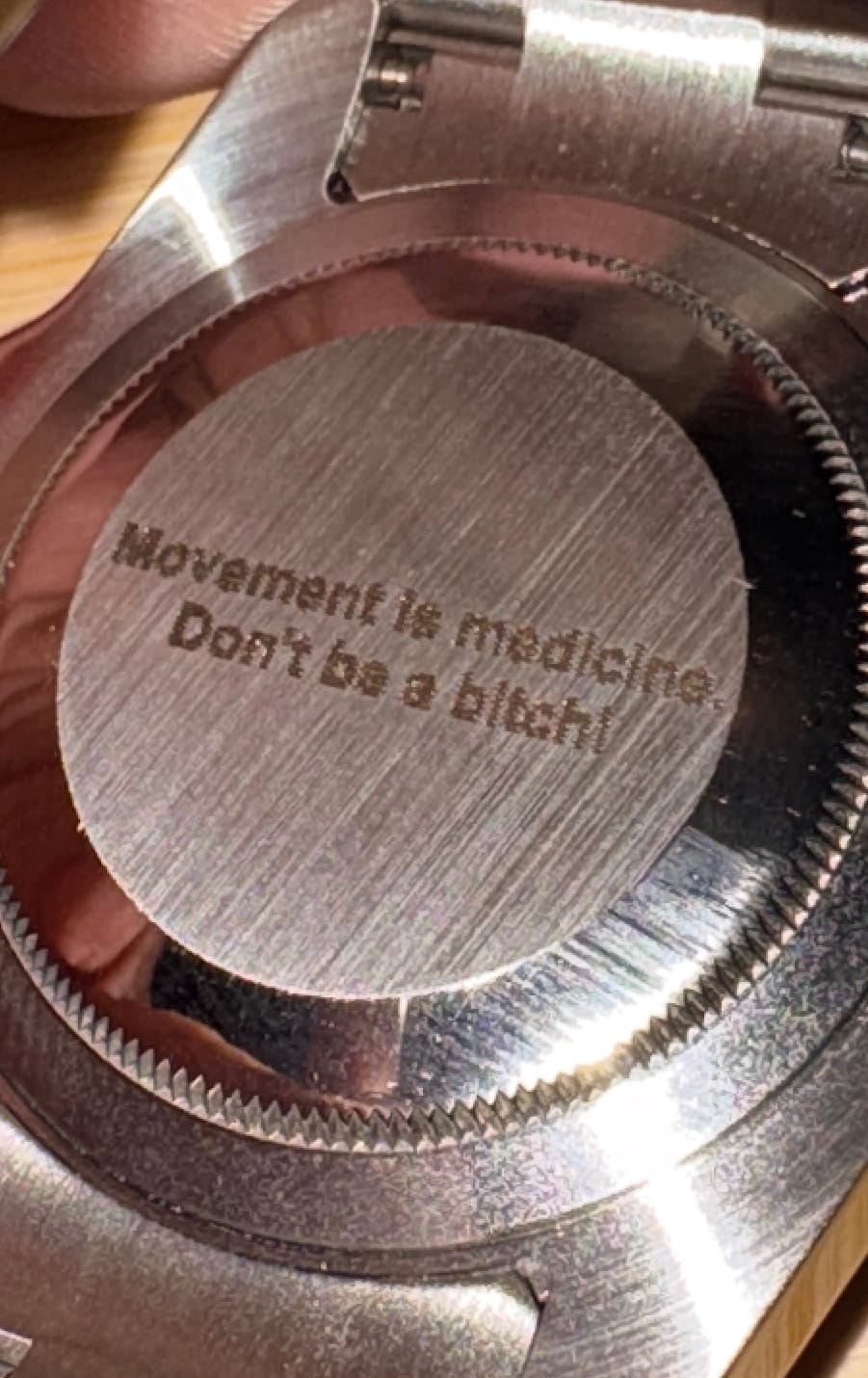 I had a lot of choices for the face and bezel, but went with the Blue because it represents the color they use on ribbons to support colorectal cancer (which he has a touch of, he's working hard to not have it). I had each of them inscribed with "Movement is Medicine. Don't be a bitch." It's something that I need a reminder of, and he tells me this all the time.